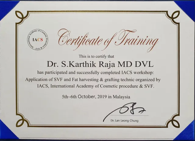Dr.S.Karthikraja MD DVL is a Medical Council Registered Dermatologist. After completing his MBBS he got extensive training in Emergency medicine and Critical care medicine, he served as a casualty medical officer in a leading hospital. After Completing MD in Dermatology Venereology and Leprosy, also secured a “Diploma in Aesthetic Medicine” from the American Academy of Aesthetic Medicine (USA).